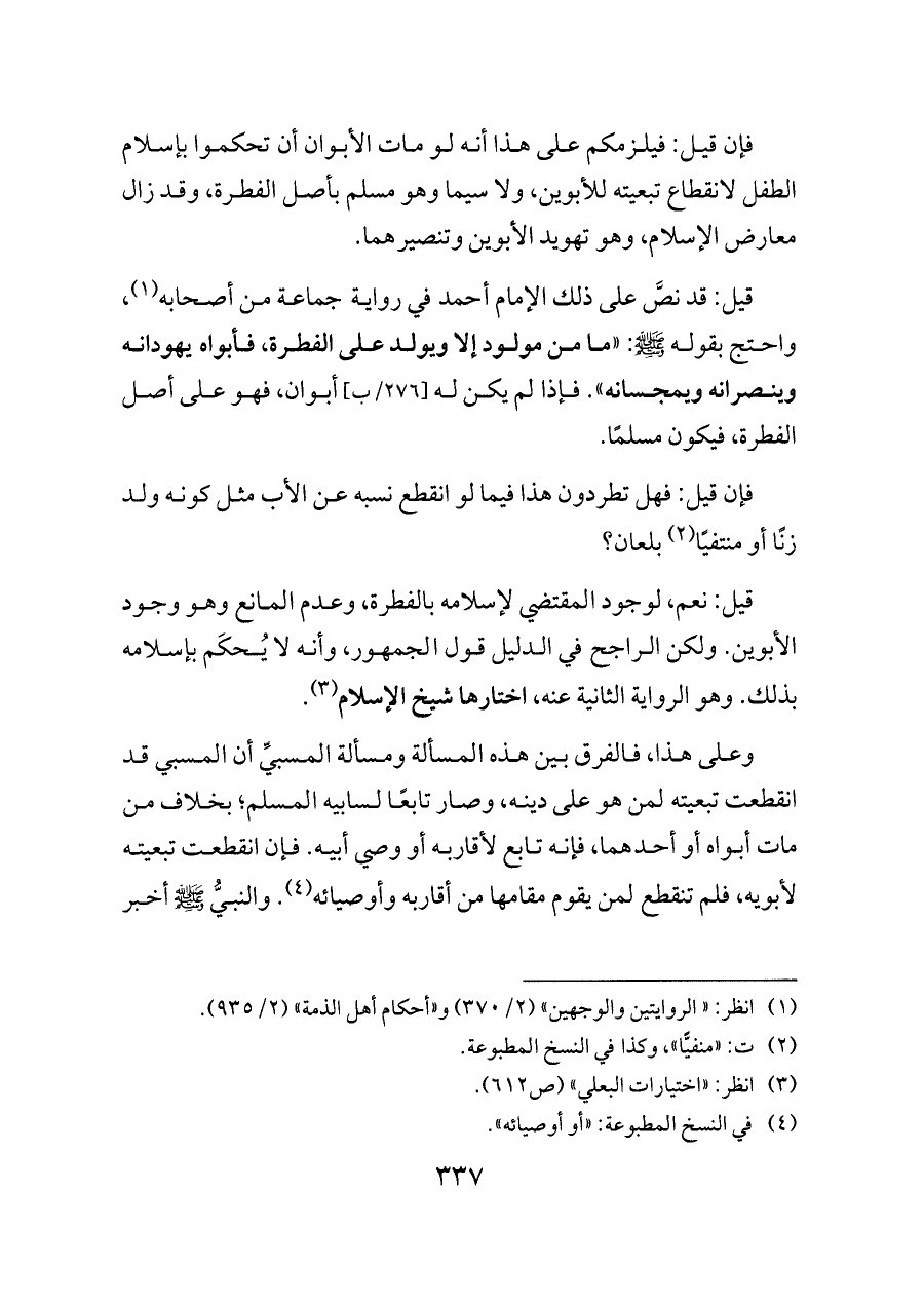 وعلى هذا، فالفرق بين هذه المسألة ومسألة المسبيِّ أن المسبي قد انقطعت تبعيته لمن هو على دينه، وصار تابعًا لسابيه المسلم؛ بخلاف من مات أبواه أو أحدهما، فإنه تابع لأقاربه أو وصي أبيه. فإن انقطعت تبعيته لأبويه، فلم تنقطع لمن يقوم مقامها من أقاربه وأوصيائه (¬٤). والنبيُّ - صلى الله عليه وسلم - أخبر