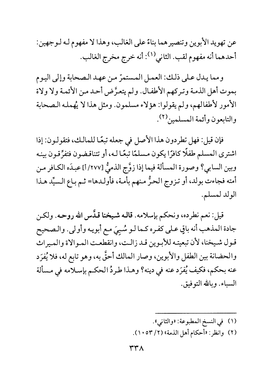 ومما يدل على ذلك: العمل المستمرّ من عهد الصحابة وإلى اليوم بموت أهل الذمة وتركهم الأطفال. ولم يتعرَّض أحد من الأئمة ولا ولاة الأمور لأطفالهم، ولم يقولوا: هؤلاء مسلمون. ومثل هذا لا يُهمله الصحابة والتابعون وأئمة المسلمين (¬٢).