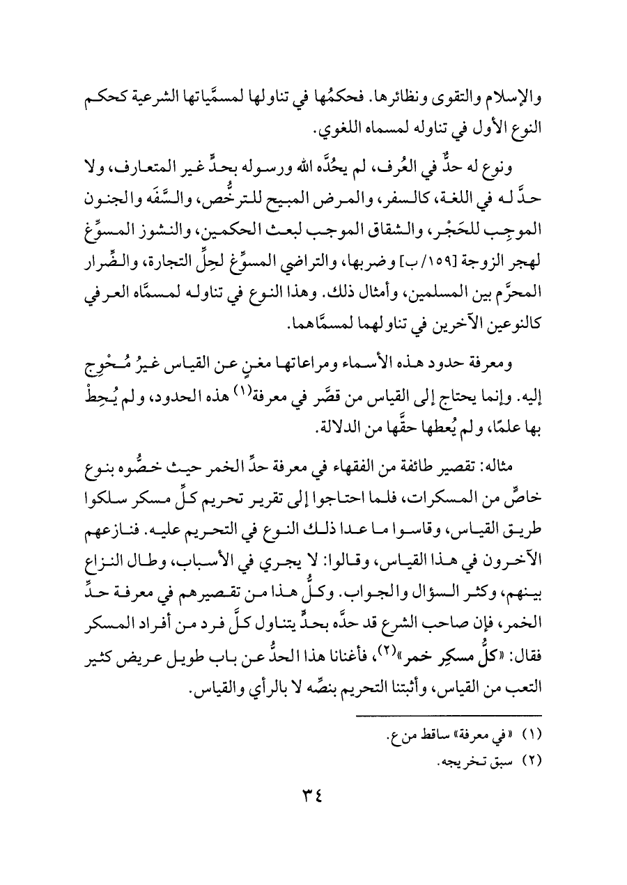 مثاله: تقصير طائفة من الفقهاء في معرفة حدِّ الخمر حيث خصُّوه بنوع خاصٍّ من المسكرات، فلما احتاجوا إلى تقرير تحريم كلِّ مسكر سلكوا طريق القياس، وقاسوا ما عدا ذلك النوع في التحريم عليه. فنازعهم الآخرون في هذا القياس، وقالوا: لا يجري في الأسباب، وطال النزاع بينهم، وكثر السؤال والجواب. وكلُّ هذا من تقصيرهم في معرفة حدِّ الخمر، فإن صاحب الشرع قد حدَّه بحدٍّ يتناول كلَّ فرد من أفراد المسكر فقال: «كلُّ مسكِر خمر» (¬٢)، فأغنانا هذا الحدُّ عن باب طويل عريض كثير التعب من القياس، وأثبتنا التحريم بنصِّه لا بالرأي والقياس.