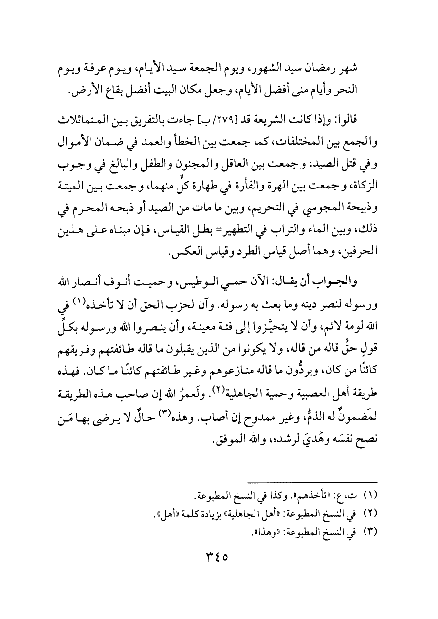 والجواب أن يقال: الآن حمي الوطيس، وحميت أنوف أنصار الله ورسوله لنصر دينه وما بعث به رسوله. وآن لحزب الحق أن لا تأخذه (¬١) في الله لومة لائم، وأن لا يتحيَّزوا إلى فئة معينة، وأن ينصروا الله ورسوله بكلِّ قولٍ حقٍّ قاله من قاله، ولا يكونوا من الذين يقبلون ما قاله طائفتهم وفريقهم كائنًا من كان، ويردُّون ما قاله منازعوهم وغير طائفتهم كائنًا ما كان. فهذه طريقة أهل العصبية وحمية الجاهلية (¬٢). ولَعمرُ الله إن صاحب هذه الطريقة لَمضمونٌ له الذمُّ، وغير ممدوح إن أصاب. وهذه (¬٣) حالٌ لا يرضى بها مَن نصح نفسَه وهُديَ لرشده، والله الموفق.