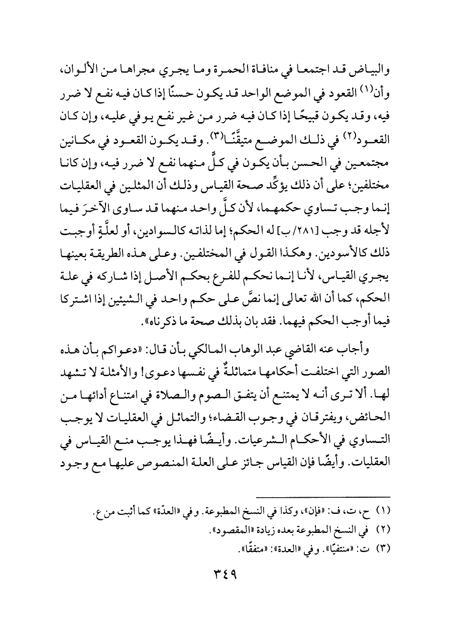 والبياض قد اجتمعا في منافاة الحمرة وما يجري مجراها من الألوان، وأن (¬١) القعود في الموضع الواحد قد يكون حسنًا إذا كان فيه نفع لا ضرر فيه، وقد يكون قبيحًا إذا كان فيه ضرر من غير نفع يوفي عليه، وإن كان القعود (¬٢) في ذلك الموضع متيقَّنًا (¬٣). وقد يكون القعود في مكانين مجتمعين في الحسن بأن يكون في كلٍّ منهما نفع لا ضرر فيه، وإن كانا مختلفين؛ على أن ذلك يؤكِّد صحة القياس وذلك أن المثلين في العقليات إنما وجب تساوي حكمهما، لأن كلَّ واحد منهما قد ساوى الآخرَ فيما لأجله قد وجب [٢٨١/ب] له الحكم؛ إما لذاته كالسوادين، أو لعلَّةٍ أوجبت ذلك كالأسودين. وهكذا القول في المختلفين. وعلى هذه الطريقة بعينها يجري القياس، لأنا إنما نحكم للفرع بحكم الأصل إذا شاركه في علة الحكم، كما أن الله تعالى إنما نصَّ على حكم واحد في الشيئين إذا اشتركا فيما أوجب الحكم فيهما. فقد بان بذلك صحة ما ذكرناه».