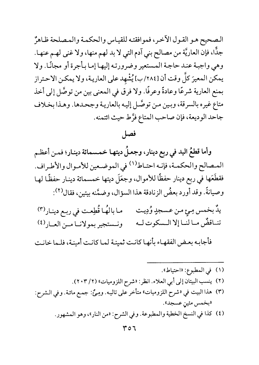 وأما قطعُ اليد في ربع دينار، وجعلُ ديتها خمسمائة دينار؛ فمن أعظم المصالح والحكمة، فإنه احتاط (¬١) في الموضعين للأموال والأطراف. فقطَعَها في ربع دينار حفظًا للأموال، وجعَلَ ديتها خمسمائة دينار حفظًا لها وصيانةً. وقد أورد بعضُ الزنادقة هذا السؤال، وضمَّنه بيتين، فقال (¬٢):