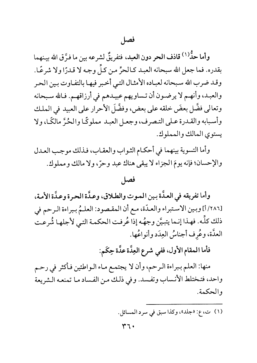 وأما تفريقه في العدَّة بين الموت والطلاق، وعدَّة الحرة وعدَّة الأمة، [٢٨٦/أ] وبين الاستبراء والعدّة، مع أن المقصود: العلمُ ببراءة الرحم في ذلك كلِّه. فهذا إنما يتبيَّن وجهُه إذا عُرفت الحكمة التي لأجلها شُرعت العدَّة، وعُرِف أجناسُ العِدَد وأنواعُها.