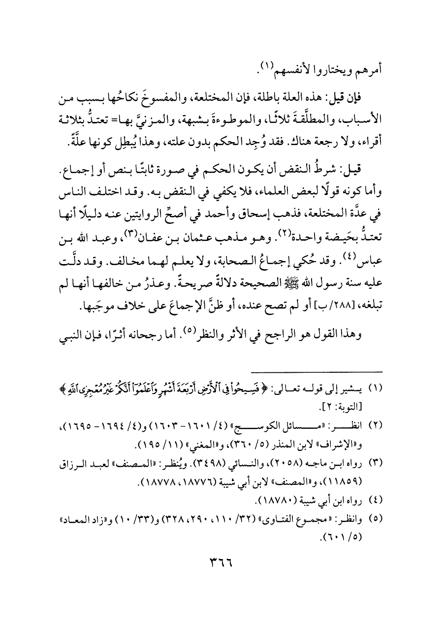 قيل: شرطُ النقض أن يكون الحكم في صورة ثابتًا بنص أو إجماع. وأما كونه قولًا لبعض العلماء، فلا يكفي في النقض به. وقد اختلف الناس في عدَّة المختلعة، فذهب إسحاق وأحمد في أصحِّ الروايتين عنه دليلًا أنها تعتدُّ بحَيضة واحدة (¬٢). وهو مذهب عثمان بن عفان (¬٣)، وعبد الله بن عباس (¬٤). وقد حُكي إجماعُ الصحابة، ولا يعلم لهما مخالف. وقد دلَّت عليه سنة رسول الله - صلى الله عليه وسلم - الصحيحة دلالةً صريحةً. وعذرُ من خالفها أنها لم تبلغه، [٢٨٨/ب] أو لم تصح عنده، أو ظنَّ الإجماعَ على خلاف موجَبها.