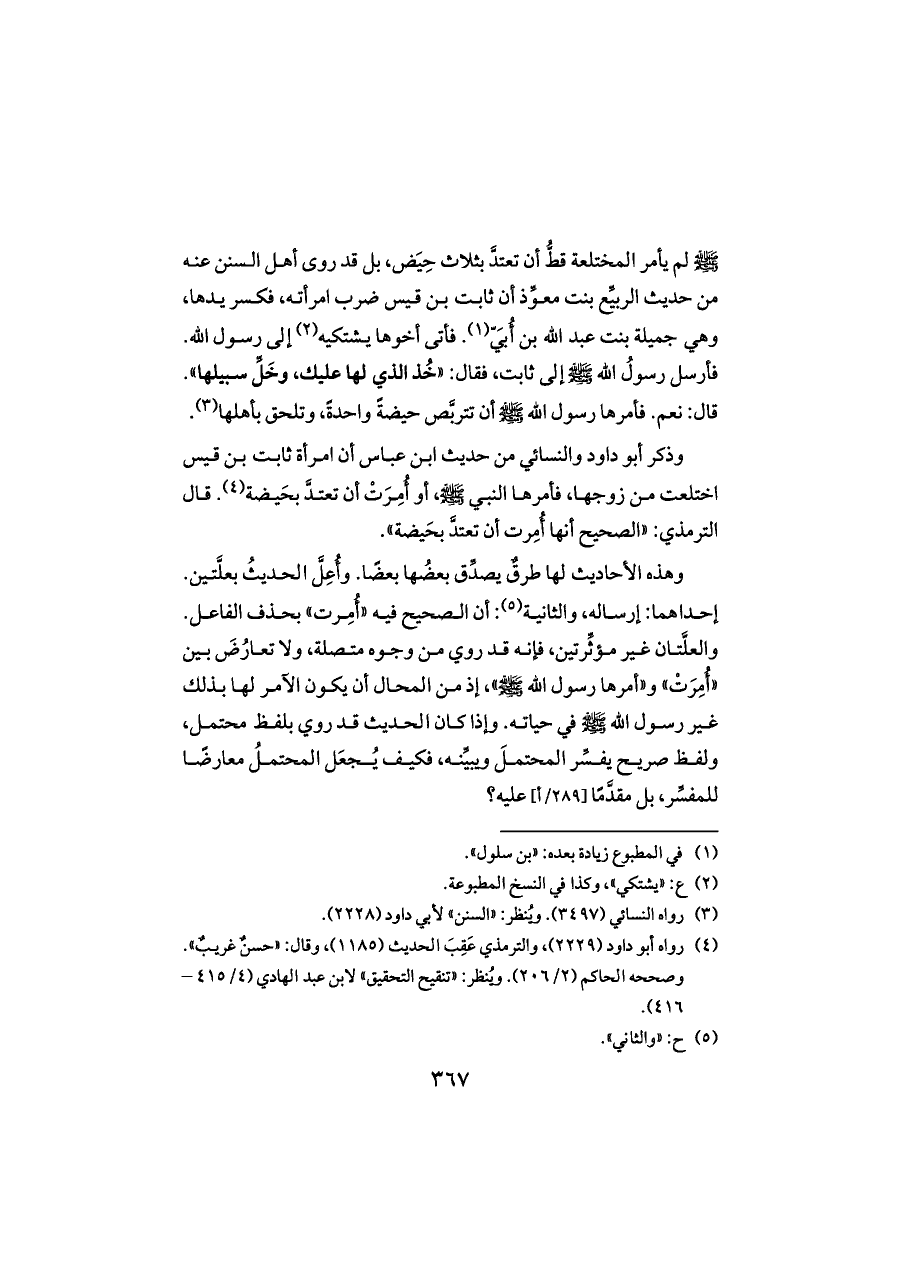 وذكر أبو داود والنسائي من حديث ابن عباس أن امرأة ثابت بن قيس اختلعت من زوجها، فأمرها النبي - صلى الله عليه وسلم -، أو أُمِرَتْ أن تعتدَّ بحَيضة (¬٤). قال الترمذي: «الصحيح أنها أُمِرت أن تعتدَّ بحَيضة».