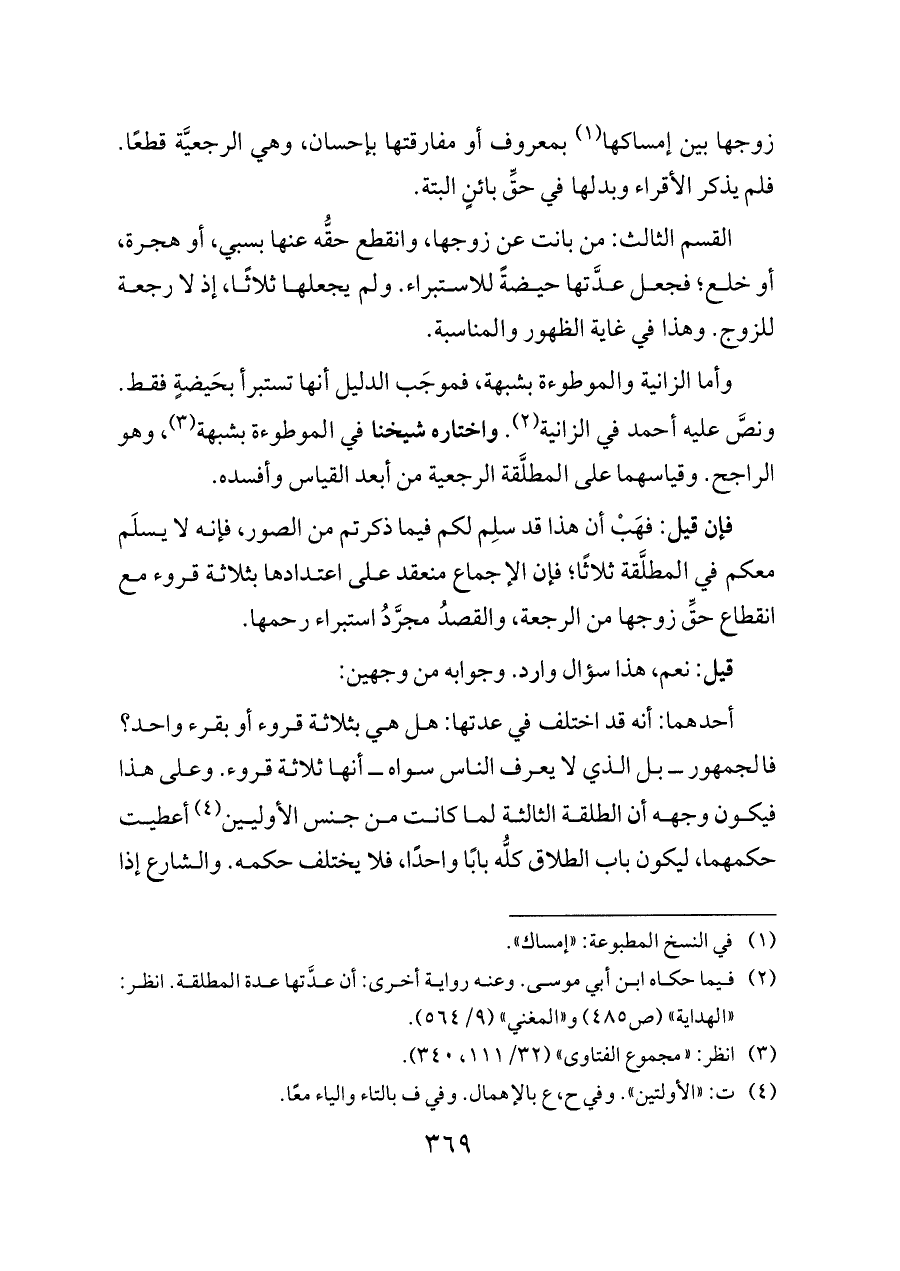 وأما الزانية والموطوءة بشبهة، فموجَب الدليل أنها تستبرأ بحَيضةٍ فقط. ونصَّ عليه أحمد في الزانية (¬٢). واختاره شيخنا في الموطوءة بشبهة (¬٣)، وهو الراجح. وقياسهما على المطلَّقة الرجعية من أبعد القياس وأفسده.