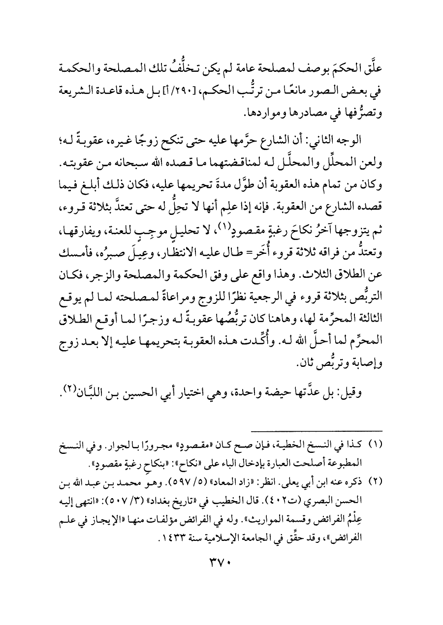 الوجه الثاني: أن الشارع حرَّمها عليه حتى تنكح زوجًا غيره، عقوبةً له؛ ولعن المحلِّل والمحلَّل له لمناقضتهما ما قصده الله سبحانه من عقوبته. وكان من تمام هذه العقوبة أن طوَّل مدةَ تحريمها عليه، فكان ذلك أبلغ فيما قصده الشارع من العقوبة. فإنه إذا علِم أنها لا تحِلُّ له حتى تعتدَّ بثلاثة قروء، ثم يتزوجها آخرُ نكاحَ رغبةٍ مقصودٍ (¬١)، لا تحليلٍ موجِبٍ للعنة، ويفارقها، وتعتدُّ من فراقه ثلاثة قروء أُخَر= طال عليه الانتظار، وعِيلَ صبرُه، فأمسك عن الطلاق الثلاث. وهذا واقع على وفق الحكمة والمصلحة والزجر، فكان التربُّص بثلاثة قروء في الرجعية نظرًا للزوج ومراعاةً لمصلحته لما لم يوقع الثالثة المحرِّمة لها، وهاهنا كان تربُّصُها عقوبةً له وزجرًا لما أوقع الطلاق المحرِّم لما أحلَّ الله له. وأُكِّدت هذه العقوبة بتحريمها عليه إلا بعد زوج وإصابة وتربُّص ثان.