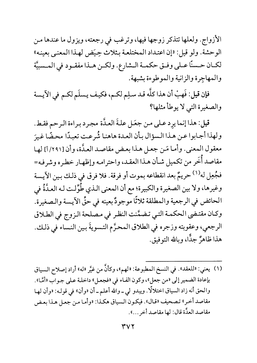 قيل: هذا إنما يرِد على من جعَل علةَ العدَّة مجرد براءة الرحم فقط. ولهذا أجابوا عن هذا السؤال بأن العدة هاهنا شُرعت تعبدًا محضًا غيرَ معقول المعنى. وأما مَن جعل هذا بعض مقاصد العدَّة، وأن [٢٩١/أ] لها مقاصد أُخَر من تكميل شأن هذا العقد، واحترامه وإظهار خطره وشرفه= فجُعِل له (¬١) حريمٌ بعد انقطاعه بموت أو فرقة. فلا فرق في ذلك بين الآيسة وغيرها، ولا بين الصغيرة والكبيرة؛ مع أن المعنى الذي طُوِّلت له العدَّةُ في الحائض في الرجعية والمطلقة ثلاثًا موجودٌ بعينه في حقِّ الآيسة والصغيرة. وكان مقتضى الحكمة التي تضمَّنت النظر في مصلحة الزوج في الطلاق الرجعي، وعقوبته وزجره في الطلاق المحرَّم التسويةَ بين النساء في ذلك. هذا ظاهرٌ جدًّا، وبالله التوفيق.