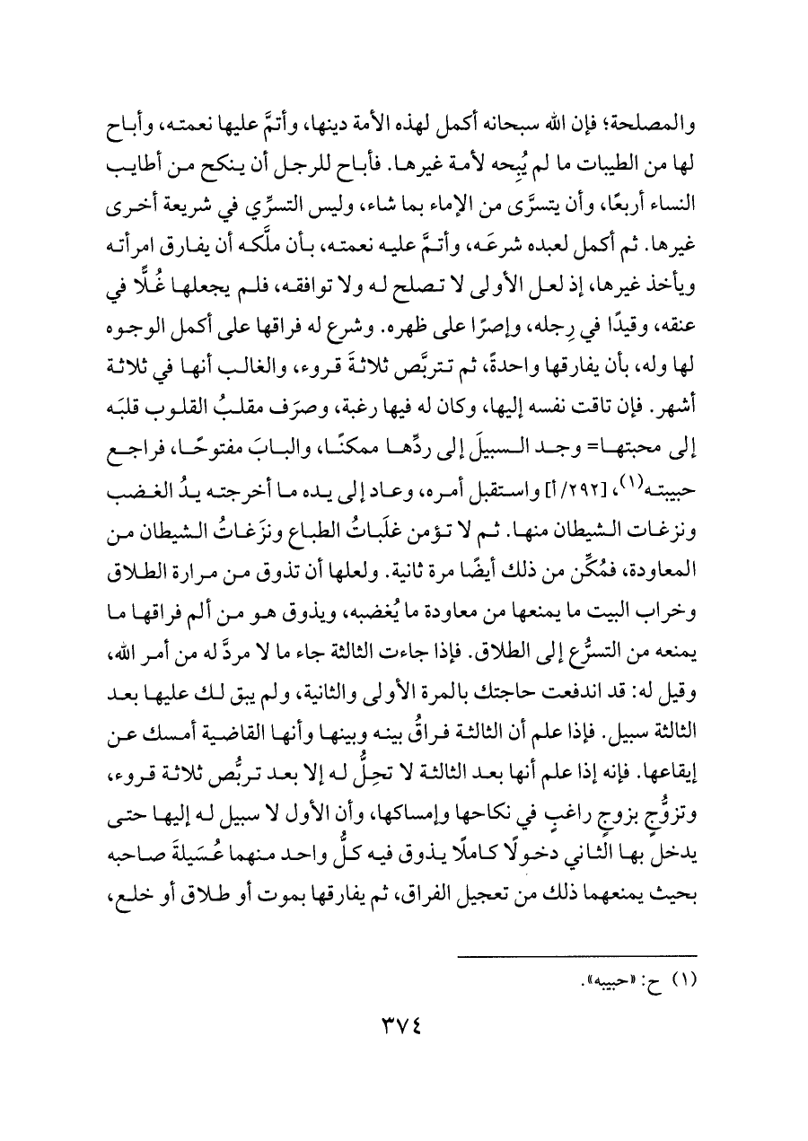 والمصلحة؛ فإن الله سبحانه أكمل لهذه الأمة دينها، وأتمَّ عليها نعمته، وأباح لها من الطيبات ما لم يُبِحه لأمة غيرها. فأباح للرجل أن ينكح من أطايب النساء أربعًا، وأن يتسرَّى من الإماء بما شاء، وليس التسرِّي في شريعة أخرى غيرها. ثم أكمل لعبده شرعَه، وأتمَّ عليه نعمته، بأن ملَّكه أن يفارق امرأته ويأخذ غيرها، إذ لعل الأولى لا تصلح له ولا توافقه، فلم يجعلها غُلًّا في عنقه، وقيدًا في رِجله، وإصرًا على ظهره. وشرع له فراقها على أكمل الوجوه لها وله، بأن يفارقها واحدةً، ثم تتربَّص ثلاثةَ قروء، والغالب أنها في ثلاثة أشهر. فإن تاقت نفسه إليها، وكان له فيها رغبة، وصرَف مقلبُ القلوب قلبَه إلى محبتها= وجد السبيلَ إلى ردِّها ممكنًا، والبابَ مفتوحًا، فراجع حبيبته (¬١)، [٢٩٢/أ] واستقبل أمره، وعاد إلى يده ما أخرجته يدُ الغضب ونزغات الشيطان منها. ثم لا تؤمن غلَباتُ الطباع ونزَغاتُ الشيطان من المعاودة، فمُكِّن من ذلك أيضًا مرة ثانية. ولعلها أن تذوق من مرارة الطلاق وخراب البيت ما يمنعها من معاودة ما يُغضبه، ويذوق هو من ألم فراقها ما يمنعه من التسرُّع إلى الطلاق. فإذا جاءت الثالثة جاء ما لا مردَّ له من أمر الله، وقيل له: قد اندفعت حاجتك بالمرة الأولى والثانية، ولم يبق لك عليها بعد الثالثة سبيل. فإذا علم أن الثالثة فراقُ بينه وبينها وأنها القاضية أمسك عن إيقاعها.