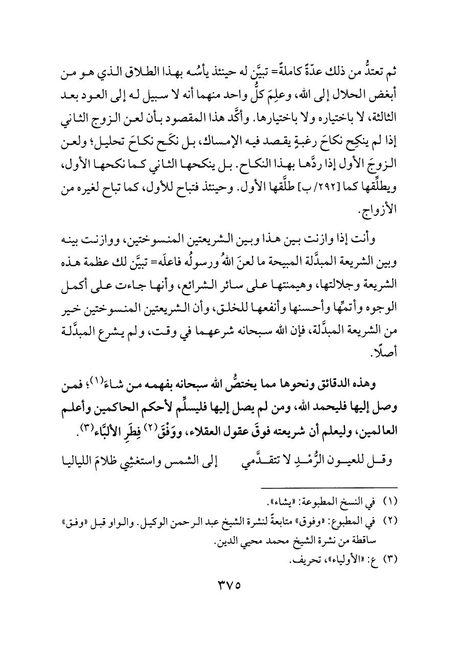 (¬٢) في المطبوع: «وفوق» متابعةً لنشرة الشيخ عبد الرحمن الوكيل. والواو قبل «وفق» ساقطة من نشرة الشيخ محمد محيي الدين.