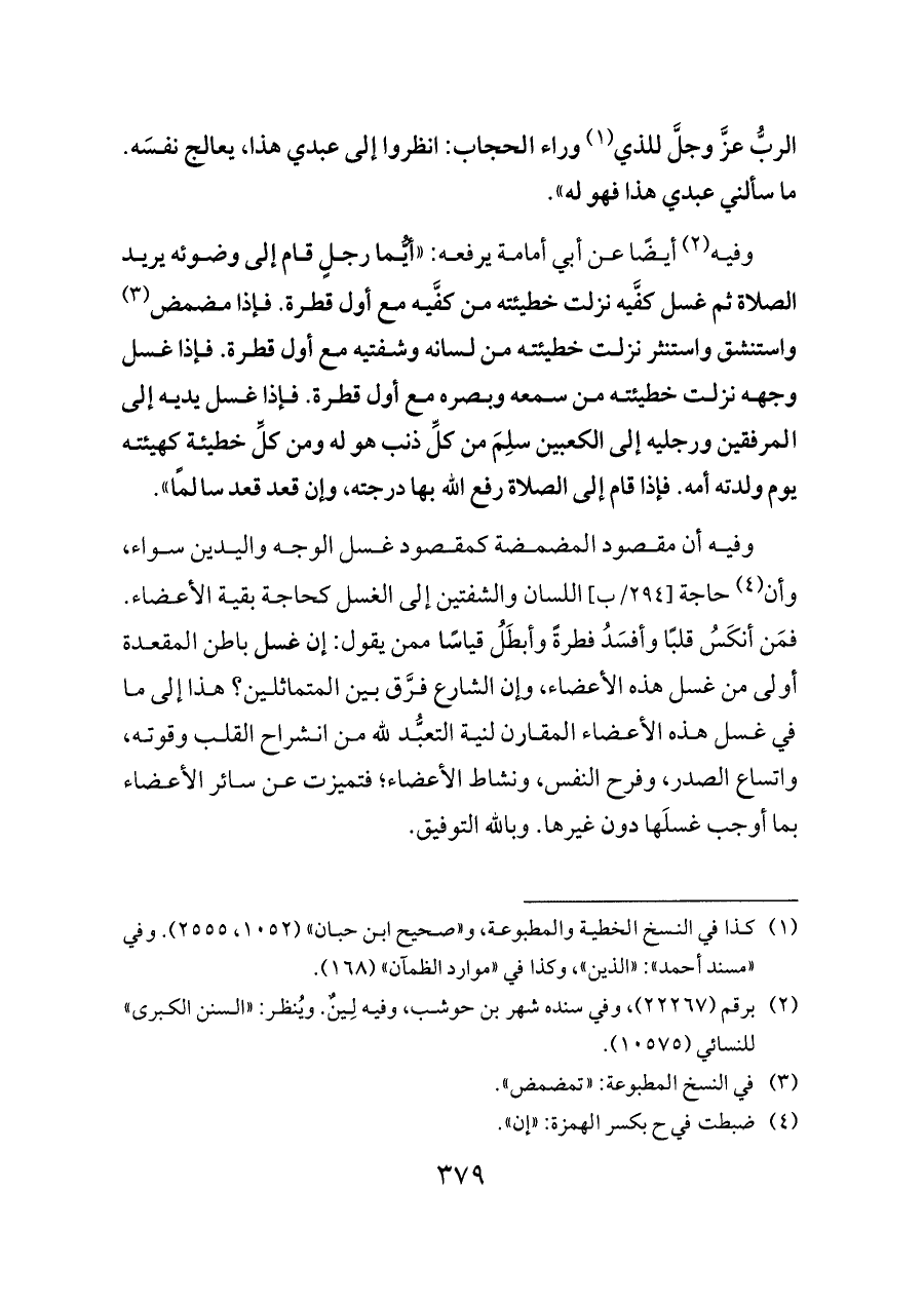 وفيه (¬٢) أيضًا عن أبي أمامة يرفعه: «أيُّما رجلٍ قام إلى وضوئه يريد الصلاة ثم غسل كفَّيه نزلت خطيئته من كفَّيه مع أول قطرة. فإذا مضمض (¬٣) واستنشق واستنثر نزلت خطيئته من لسانه وشفتيه مع أول قطرة. فإذا غسل وجهه نزلت خطيئته من سمعه وبصره مع أول قطرة. فإذا غسل يديه إلى المرفقين ورجليه إلى الكعبين سلِمَ من كلِّ ذنب هو له ومن كلِّ خطيئة كهيئته يوم ولدته أمه. فإذا قام إلى الصلاة رفع الله بها درجته، وإن قعد قعد سالمًا».