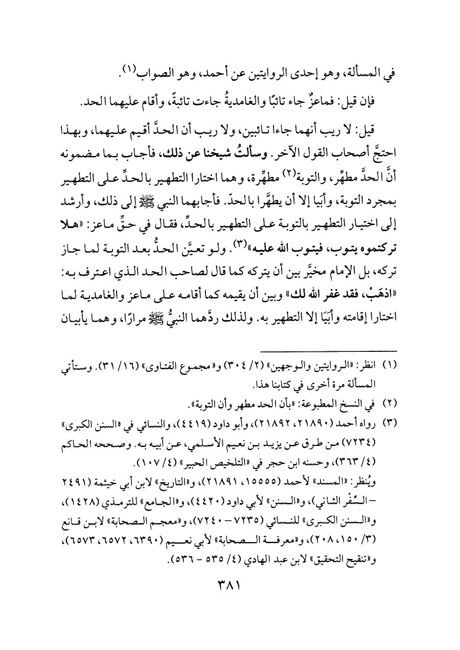 قيل: لا ريب أنهما جاءا تائبين، ولا ريب أن الحدَّ أقيم عليهما، وبهذا احتجَّ أصحاب القول الآخر. وسألتُ شيخنا عن ذلك، فأجاب بما مضمونه أنَّ الحدَّ مطهِّر، والتوبة (¬٢) مطهِّرة، وهما اختارا التطهير بالحدِّ على التطهير بمجرد التوبة، وأبَيا إلا أن يطهَّرا بالحدّ. فأجابهما النبي - صلى الله عليه وسلم - إلى ذلك، وأرشد إلى اختيار التطهير بالتوبة على التطهير بالحدِّ، فقال في حقِّ ماعز: «هلا تركتموه يتوب، فيتوب الله عليه» (¬٣). ولو تعيَّن الحدُّ بعد التوبة لما جاز تركه، بل الإمام مخيَّر بين أن يتركه كما قال لصاحب الحد الذي اعترف به: «اذهَبْ، فقد غفر الله لك» وبين أن يقيمه كما أقامه على ماعز والغامدية لما اختارا إقامته وأبَيَا إلا التطهير به. ولذلك ردَّهما النبيُّ - صلى الله عليه وسلم - مرارًا، وهما يأبيان