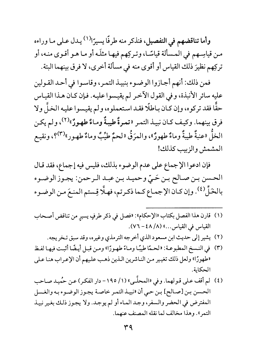 فمن ذلك: أنهم أجازوا الوضوء بنبيذ التمر، وقاسوا في أحد القولين عليه سائر الأنبذة، وفي القول الآخر لم يقيسوا عليه. فإن كان هذا القياس حقًّا فقد تركوه، وإن كان باطلًا فقد استعملوه، ولم يقيسوا عليه الخلَّ ولا فرق بينهما. وكيف كان نبيذ التمر «تمرةٌ طيبةٌ وماءٌ طهورٌ» (¬٢)، ولم يكن الخلُّ «عنبةٌ طيبةٌ وماءٌ طهورٌ»، والمرَقُ «لحمٌ طيِّبٌ وماءٌ طهور» (¬٣)؟، ونقيع المشمش والزبيب كذلك!