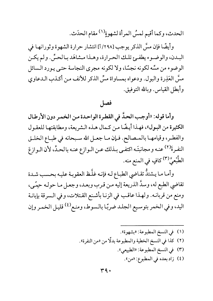 وأما قوله: «أوجب الحدَّ في القطرة الواحدة من الخمر دون الأرطال الكثيرة من البول»، فهذا أيضًا من كمال هذه الشريعة، ومطابقتها للعقول والفطر، وقيامها بالمصالح. فإن ما جعل الله سبحانه في طباع الخلق النفرةَ (¬٢) عنه ومجانبتَه اكتفى بذلك عن الوازع عنه بالحدِّ، لأن الوازعَ الطَّبْعيَّ (¬٣) كافٍ في المنع منه.