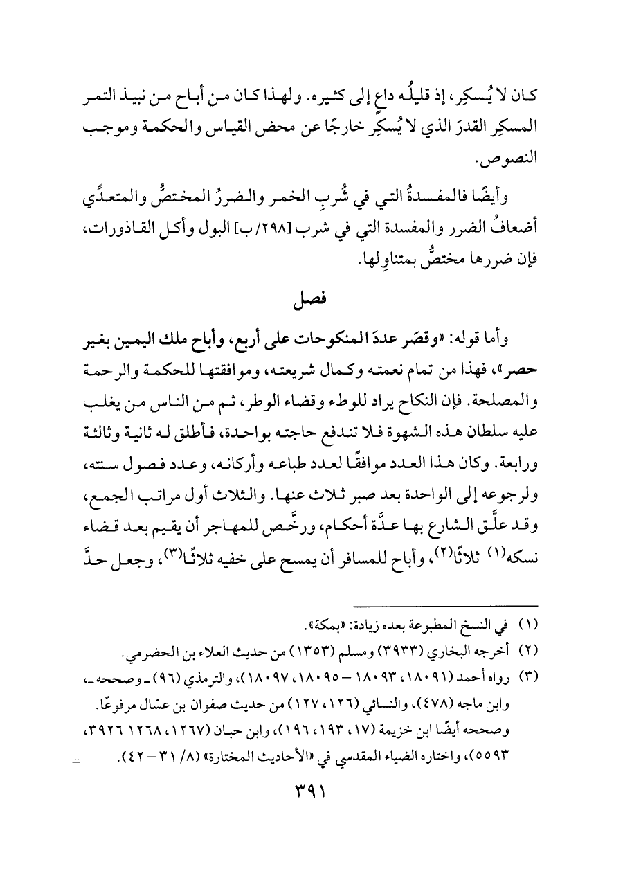 وأما قوله: «وقصَر عددَ المنكوحات على أربع، وأباح ملك اليمين بغير حصر»، فهذا من تمام نعمته وكمال شريعته، وموافقتها للحكمة والرحمة والمصلحة. فإن النكاح يراد للوطء وقضاء الوطر، ثم من الناس من يغلب عليه سلطان هذه الشهوة فلا تندفع حاجته بواحدة، فأطلق له ثانية وثالثة ورابعة. وكان هذا العدد موافقًا لعدد طباعه وأركانه، وعدد فصول سنته، ولرجوعه إلى الواحدة بعد صبر ثلاث عنها. والثلاث أول مراتب الجمع، وقد علَّق الشارع بها عدَّة أحكام، ورخَّص للمهاجر أن يقيم بعد قضاء نسكه (¬١) ثلاثًا (¬٢)، وأباح للمسافر أن يمسح على خفيه ثلاثًا (¬٣)، وجعل حدَّ