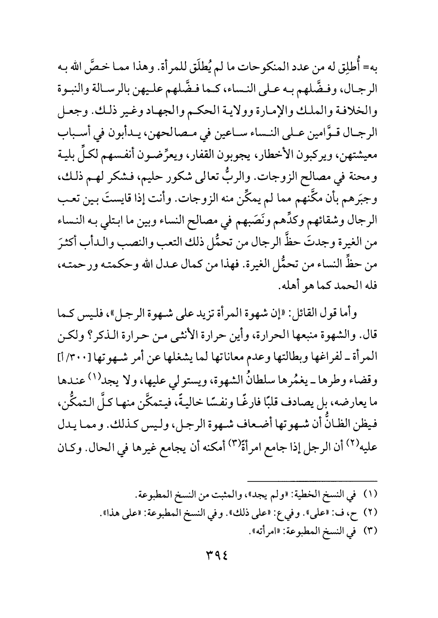 به = أُطلِق له من عدد المنكوحات ما لم يُطلَق للمرأة. وهذا مما خصَّ الله به الرجال، وفضَّلهم به على النساء، كما فضَّلهم عليهن بالرسالة والنبوة والخلافة والملك والإمارة وولاية الحكم والجهاد وغير ذلك. وجعل الرجال قوَّامين على النساء ساعين في مصالحهن، يدأبون في أسباب معيشتهن، ويركبون الأخطار، يجوبون القفار، ويعرِّضون أنفسهم لكلِّ بلية ومحنة في مصالح الزوجات. والربُّ تعالى شكور حليم، فشكر لهم ذلك، وجبَرهم بأن مكَّنهم مما لم يمكِّن منه الزوجات. وأنت إذا قايستَ بين تعب الرجال وشقائهم وكدِّهم ونَصَبهم في مصالح النساء وبين ما ابتلي به النساء من الغيرة وجدتَ حظَّ الرجال من تحمُّل ذلك التعب والنصب والدأب أكثرَ من حظِّ النساء من تحمُّل الغيرة. فهذا من كمال عدل الله وحكمته ورحمته، فله الحمد كما هو أهله.