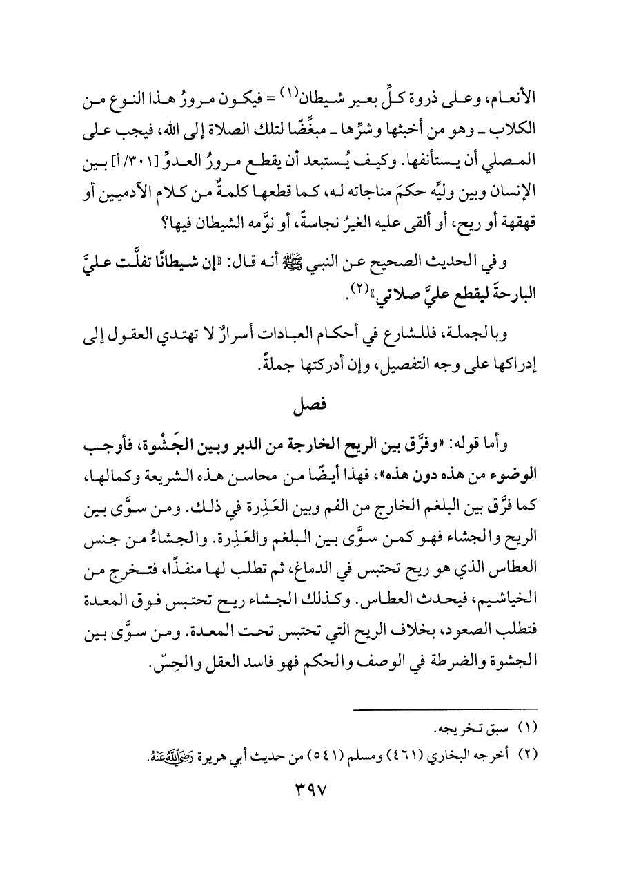 الأنعام، وعلى ذروة كلِّ بعير شيطان (¬١) = فيكون مرورُ هذا النوع من الكلاب ــ وهو من أخبثها وشرِّها ــ مبغِّضًا لتلك الصلاة إلى الله، فيجب على المصلي أن يستأنفها. وكيف يُستبعد أن يقطع مرورُ العدوِّ [٣٠١/أ] بين الإنسان وبين وليِّه حكمَ مناجاته له، كما قطعها كلمةٌ من كلام الآدميين أو قهقهة أو ريح، أو ألقى عليه الغيرُ نجاسةً، أو نوَّمه الشيطان فيها؟