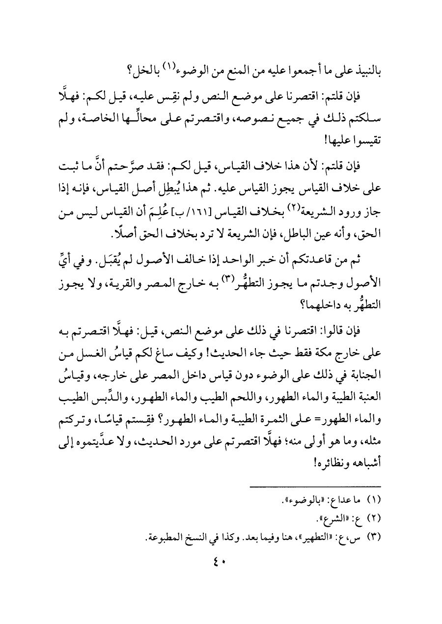 فإن قالوا: اقتصرنا في ذلك على موضع النص، قيل: فهلَّا اقتصرتم به على خارج مكة فقط حيث جاء الحديث! وكيف ساغ لكم قياسُ الغسل من الجنابة في ذلك على الوضوء دون قياس داخل المصر على خارجه، وقياسُ العنبة الطيبة والماء الطهور، واللحم الطيب والماء الطهور، والدِّبس الطيب والماء الطهور= على الثمرة الطيبة والماء الطهور؟ فقِستم قياسًا، وتركتم مثله، وما هو أولى منه؛ فهلَّا اقتصرتم على مورد الحديث، ولا عدَّيتموه إلى أشباهه ونظائره!