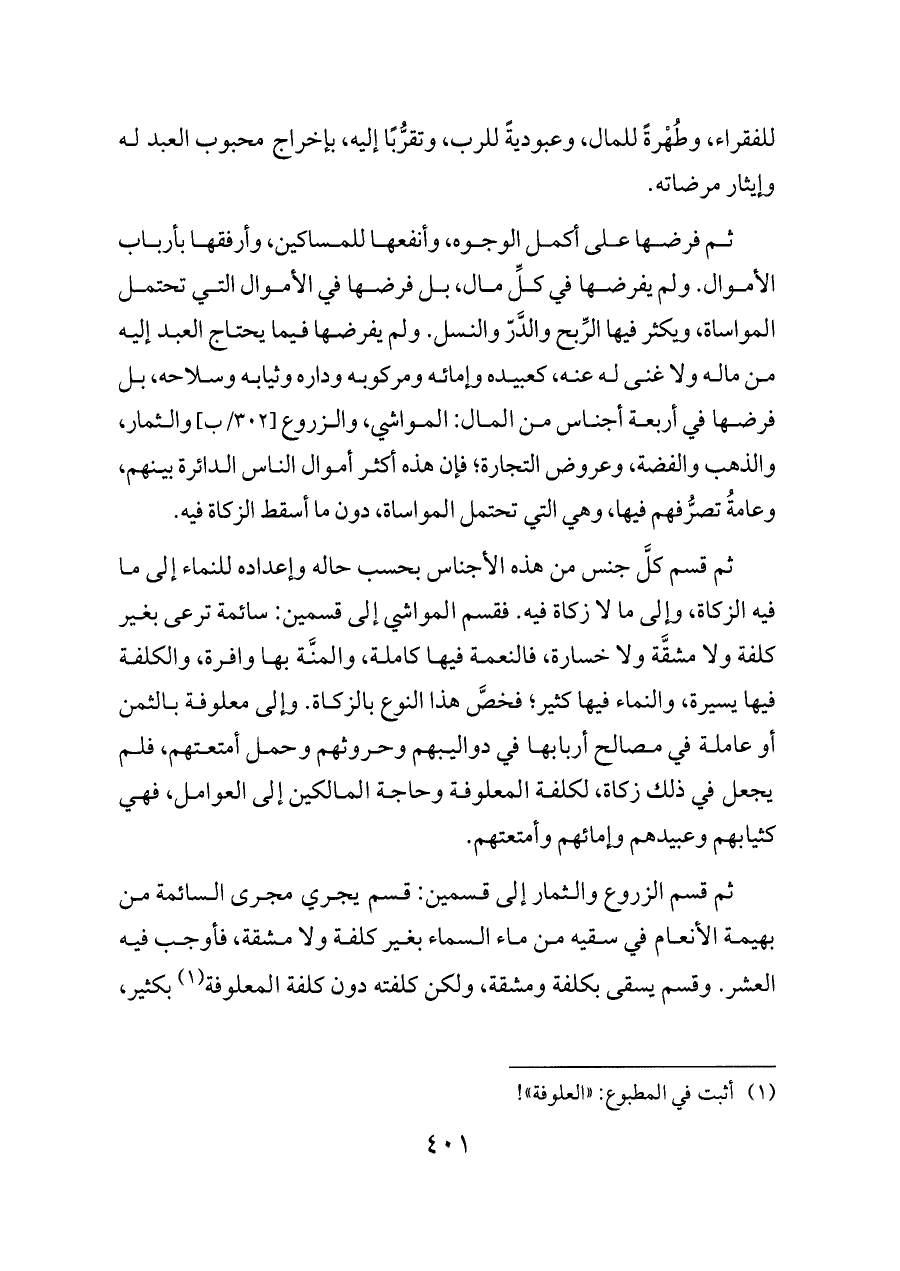 ثم قسم كلَّ جنس من هذه الأجناس بحسب حاله وإعداده للنماء إلى ما فيه الزكاة، وإلى ما لا زكاة فيه. فقسم المواشي إلى قسمين: سائمة ترعى بغير كلفة ولا مشقَّة ولا خسارة، فالنعمة فيها كاملة، والمنَّة بها وافرة، والكلفة فيها يسيرة، والنماء فيها كثير؛ فخصَّ هذا النوع بالزكاة. وإلى معلوفة بالثمن أو عاملة في مصالح أربابها في دواليبهم وحروثهم وحمل أمتعتهم، فلم يجعل في ذلك زكاة، لكلفة المعلوفة وحاجة المالكين إلى العوامل، فهي كثيابهم وعبيدهم وإمائهم وأمتعتهم.