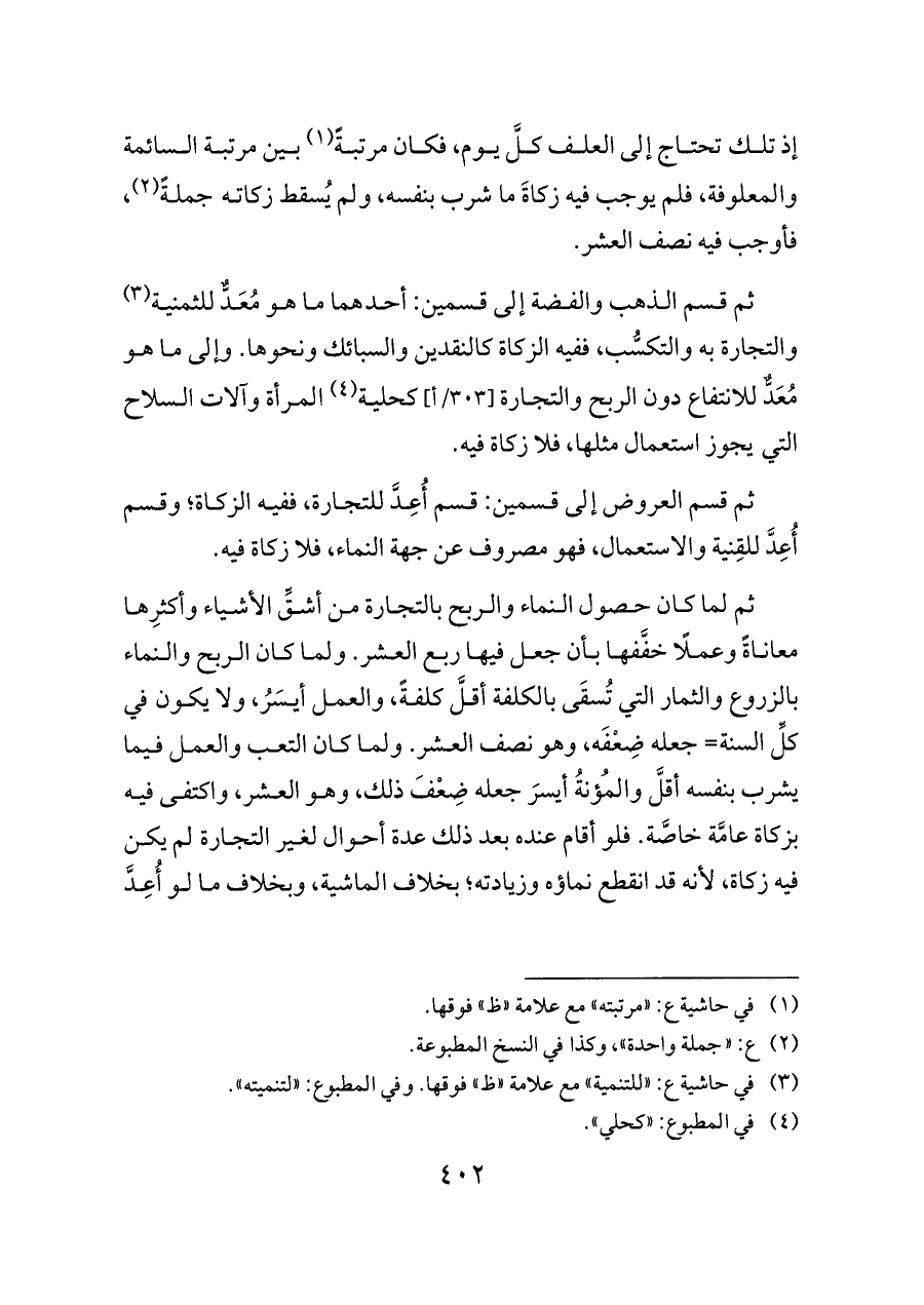 ثم لما كان حصول النماء والربح بالتجارة من أشقِّ الأشياء وأكثرِها معاناةً وعملًا خفَّفها بأن جعل فيها ربع العشر. ولما كان الربح والنماء بالزروع والثمار التي تُسقَى بالكلفة أقلَّ كلفةً، والعمل أيسَرُ، ولا يكون في كلِّ السنة= جعله ضِعْفَه، وهو نصف العشر. ولما كان التعب والعمل فيما يشرب بنفسه أقلَّ والمُؤنةُ أيسرَ جعله ضِعْفَ ذلك، وهو العشر، واكتفى فيه بزكاة عامَّة خاصَّة. فلو أقام عنده بعد ذلك عدة أحوال لغير التجارة لم يكن فيه زكاة، لأنه قد انقطع نماؤه وزيادته؛ بخلاف الماشية، وبخلاف ما لو أُعِدَّ