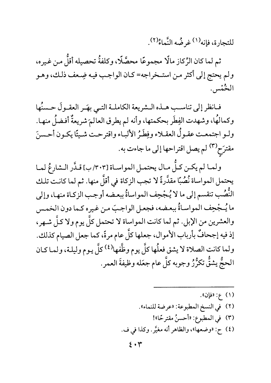 ولما لم يكن كلُّ مال يحتمل المواساة [٣٠٣/ب] قدَّر الشارعُ لما يحتمل المواساة نُصُبًا مقدَّرةً لا تجب الزكاة في أقلَّ منها. ثم لما كانت تلك النُّصُب تنقسم إلى ما لا يُجْحِف المواساةُ ببعضه أوجب الزكاة منها، وإلى ما يُجْحِف المواساةُ ببعضه، فجعل الواجبَ من غيره كما دون الخمس والعشرين من الإبل. ثم لما كانت المواساة لا تحتمل كلَّ يوم ولا كلَّ شهر، إذ فيه إجحافٌ بأرباب الأموال، جعلها كلَّ عام مرةً، كما جعل الصيام كذلك. ولما كانت الصلاة لا يشق فعلُها كلَّ يوم وظَّفها (¬٤) كلَّ يوم وليلة، ولما كان الحجُّ يشقُّ تكرُّرُ وجوبه كلَّ عام جعَله وظيفةَ العمر.