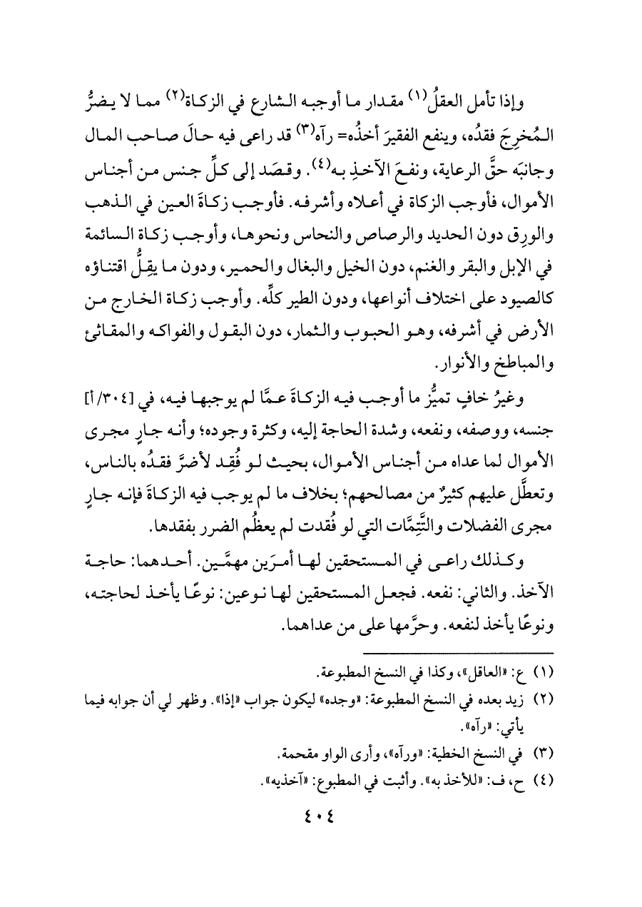 وغيرُ خافٍ تميُّز ما أوجب فيه الزكاةَ عمَّا لم يوجبها فيه، في [٣٠٤/أ] جنسه، ووصفه، ونفعه، وشدة الحاجة إليه، وكثرة وجوده؛ وأنه جارٍ مجرى الأموال لما عداه من أجناس الأموال، بحيث لو فُقِد لأضرَّ فقدُه بالناس، وتعطَّل عليهم كثيرٌ من مصالحهم؛ بخلاف ما لم يوجب فيه الزكاةَ فإنه جارٍ مجرى الفضلات والتَّتِمَّات التي لو فُقدت لم يعظُم الضرر بفقدها.