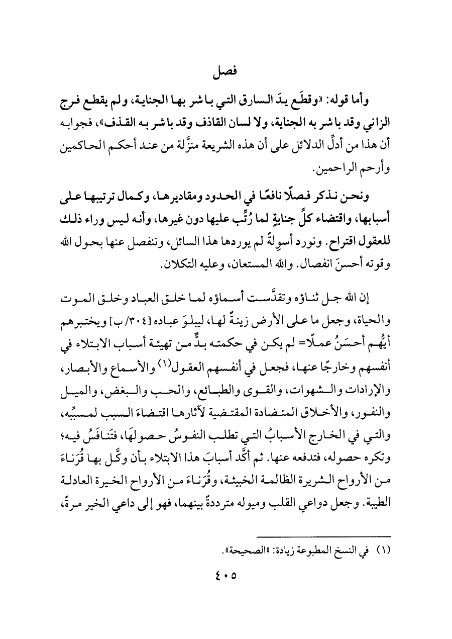 ونحن نذكر فصلًا نافعًا في الحدود ومقاديرها، وكمال ترتيبها على أسبابها، واقتضاء كلِّ جنايةٍ لما رُتِّب عليها دون غيرها، وأنه ليس وراء ذلك للعقول اقتراح. ونورد أسوِلةً لم يوردها هذا السائل، وننفصل عنها بحول الله وقوته أحسنَ انفصال. والله المستعان، وعليه التكلان.