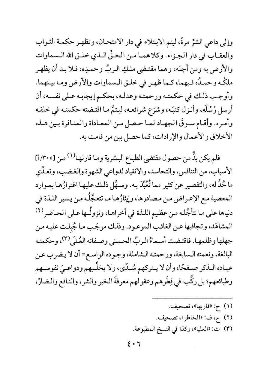 فلم يكن بدٌّ من حصول مقتضى الطباع البشرية وما قارنها (¬١) من [٣٠٥/أ] الأسباب، من التنافس، والتحاسد، والانقياد لدواعي الشهوة والغضب، وتعدِّي ما حُدَّ له، والتقصير عن كثير مما تُعُبِّدَ به. وسهَّل ذلك عليها اغترارُها بموارد المعصية مع الإعراض من مصادرها، وإيثارُها ما تتعجَّلُه من يسير اللذة في دنياها على ما تتأجَّله من عظيم اللذة في أخراها، ونزولُها على الحاضر (¬٢) المشاهَد، وتجافيها عن الغائب الموعود. وذلك موجَب ما جُبِلت عليه من جهلها وظلمها. فاقتضت أسماءُ الربِّ الحسنى وصفاته العُلَى (¬٣)، وحكمته البالغة، ونعمته السابغة، ورحمته الشاملة، وجوده الواسع= أن لا يضرب عن عباده الذكر صفحًا، وأن لا يتركهم سُدًى، ولا يخلِّيهم ودواعيَ نفوسهم وطبائعهم؛ بل ركَّب في فِطَرهم وعقولهم معرفةَ الخير والشر، والنافع والضارِّ،