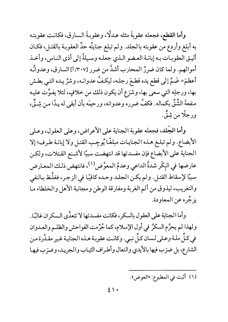 وأما القطع، فجعله عقوبةَ مثله عدلًا، وعقوبةَ السارق، فكانت عقوبته به أبلغ وأردع من عقوبته بالجلد. ولم تبلغ جنايتُه حدَّ العقوبة بالقتل، فكان أليق العقوبات به إبانة العضو الذي جعله وسيلةً إلى أذى الناس، وأخذ أموالهم. ولما كان ضررُ المحارب أشدَّ من ضرر [٣٠٧/أ] السارق، وعدوانُه أعظمَ= ضَمَّ إلى قطع يده قطعَ رجله، ليكفَّ عدوانه، وشرَّ يده التي بطش بها، ورجلِه التي سعى بها، وشرَع أن يكون ذلك من خلافٍ، لئلا يفوِّت عليه منفعةَ الشِّقِّ بكماله. فكفَّ ضرره وعدوانه، ورحِمَه بأن أبقى له يدًا من شِقٍّ، ورجلًا من شِقٍّ.