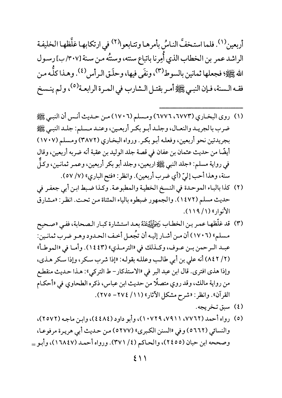 (¬٣) قد غلّظها عمر بن الخطاب - رضي الله عنه - بعد استشارة كبار الصحابة، ففي «صحيح مسلم» (١٧٠٦) أن من أشار إليه أن تُجعل أخف الحدود وهو ضرب ثمانين: عبد الرحمن بن عوف، وكذلك في «الترمذي» (١٤٤٣). وأما في «الموطأ» (٢/ ٨٤٢) أنه علي بن أبي طالب وعلله بقوله: «إذا شرب سكر، وإذا سكر هذى، وإذا هذى افترى. قال ابن عبد البر في «الاستذكار- ط التركي»: هذا حديث منقطع من رواية مالك، وقد روي متصلًا من حديث ابن عباس، ذكره الطحاوي في «أحكام القرآن». وانظر: «شرح مشكل الآثار» (١١/ ٢٧٤ - ٢٧٥).