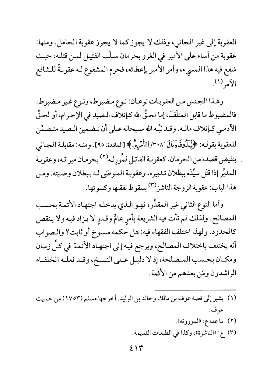 وهذا الجنس من العقوبات نوعان: نوع مضبوط، ونوع غير مضبوط. فالمضبوط ما قابل المتلَفَ، إما لحقِّ الله كإتلاف الصيد في الإحرام، أو لحقِّ الآدمي كإتلاف ماله. وقد نبَّه الله سبحانه على أن تضمين الصيد متضمِّن للعقوبة بقوله: {{لِيَذُوقَ وَبَالَ [٣٠٨/أ] أَمْرِهِ}. ومنه: مقابلة الجاني بنقيض قصده من الحرمان، كعقوبة القاتل لمُورِثه (¬٢) بحرمان ميراثه، وعقوبة المدبَّر إذا قتَل سيِّدَه ببطلان تدبيره، وعقوبة الموصَى له ببطلان وصيته. ومن هذا الباب: عقوبة الزوجة الناشز (¬٣) بسقوط نفقتها وكسوتها.