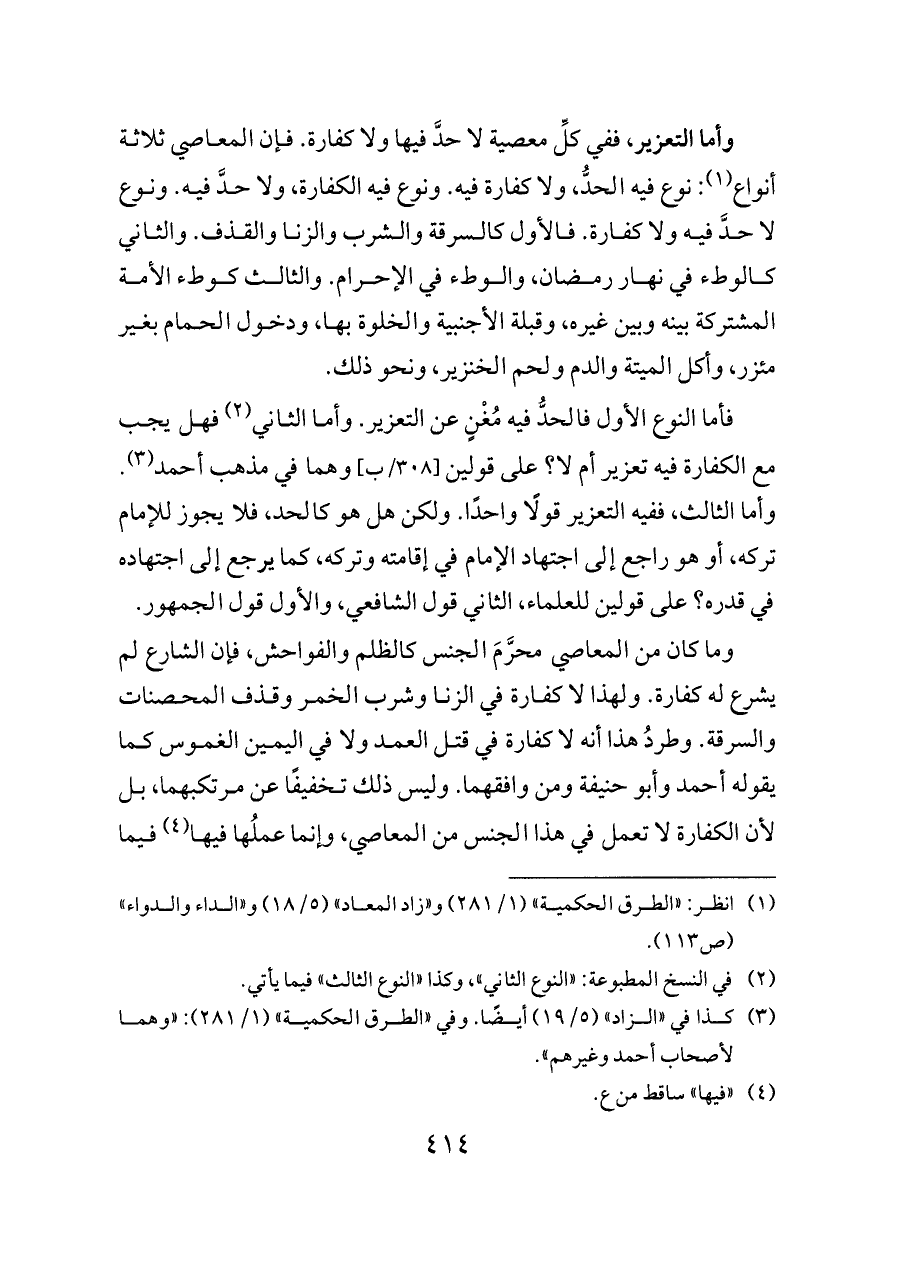 فأما النوع الأول فالحدُّ فيه مُغْنٍ عن التعزير. وأما الثاني (¬٢) فهل يجب مع الكفارة فيه تعزير أم لا؟ على قولين [٣٠٨/ب] وهما في مذهب أحمد (¬٣). وأما الثالث، ففيه التعزير قولًا واحدًا. ولكن هل هو كالحد، فلا يجوز للإمام تركه، أو هو راجع إلى اجتهاد الإمام في إقامته وتركه، كما يرجع إلى اجتهاده في قدره؟ على قولين للعلماء، الثاني قول الشافعي، والأول قول الجمهور.