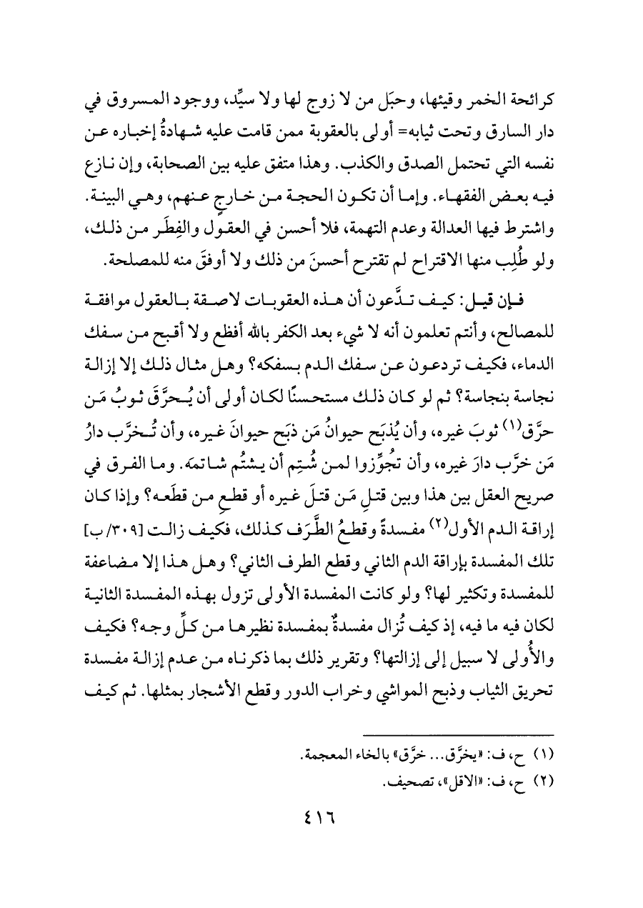 فإن قيل: كيف تدَّعون أن هذه العقوبات لاصقة بالعقول موافقة للمصالح، وأنتم تعلمون أنه لا شيء بعد الكفر بالله أفظع ولا أقبح من سفك الدماء، فكيف تردعون عن سفك الدم بسفكه؟ وهل مثال ذلك إلا إزالة نجاسة بنجاسة؟ ثم لو كان ذلك مستحسنًا لكان أولى أن يُحرَّقَ ثوبُ مَن حرَّق (¬١) ثوبَ غيره، وأن يُذبَح حيوانُ مَن ذبَح حيوانَ غيره، وأن تُخرَّب دارُ مَن خرَّب دارَ غيره، وأن تُجوِّزوا لمن شُتِم أن يشتُم شاتمَه. وما الفرق في صريح العقل بين هذا وبين قتلِ مَن قتلَ غيره أو قطعِ من قطَعه؟ وإذا كان إراقة الدم الأول (¬٢) مفسدةً وقطعُ الطَّرَف كذلك، فكيف زالت [٣٠٩/ب] تلك المفسدة بإراقة الدم الثاني وقطع الطرف الثاني؟ وهل هذا إلا مضاعفة للمفسدة وتكثير لها؟ ولو كانت المفسدة الأولى تزول بهذه المفسدة الثانية لكان فيه ما فيه، إذ كيف تُزال مفسدةٌ بمفسدة نظيرها من كلِّ وجه؟ فكيف والأُولى لا سبيل إلى إزالتها؟ وتقرير ذلك بما ذكرناه من عدم إزالة مفسدة تحريق الثياب وذبح المواشي وخراب الدور وقطع الأشجار بمثلها. ثم كيف