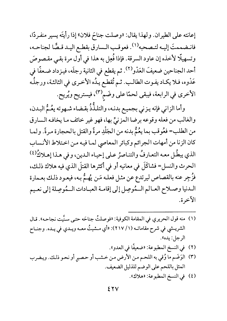 إعانته على الطيران. ولهذا يقال: «وصلت جناحَ فلان» إذا رأيتَه يسير منفردًا، فانضممتَ إليه لتصحبه (¬١). فعوقب السارق بقطع اليد قصًّا لجناحه، وتسهيلًا لأخذه إن عاود السرقة. فإذا فُعِل به هذا في أول مرة بقي مقصوصَ أحد الجناحين ضعيفَ العَدْو (¬٢). ثم يقطع في الثانية رجلَه، فيزداد ضعفًا في عَدْوه، فلا يكاد يفوت الطالب. ثم تُقطع يدُه الأخرى في الثالثة، ورجلُه الأخرى في الرابعة، فيبقى لحمًا على وضَمٍ (¬٣)، فيستريح ويُريح.