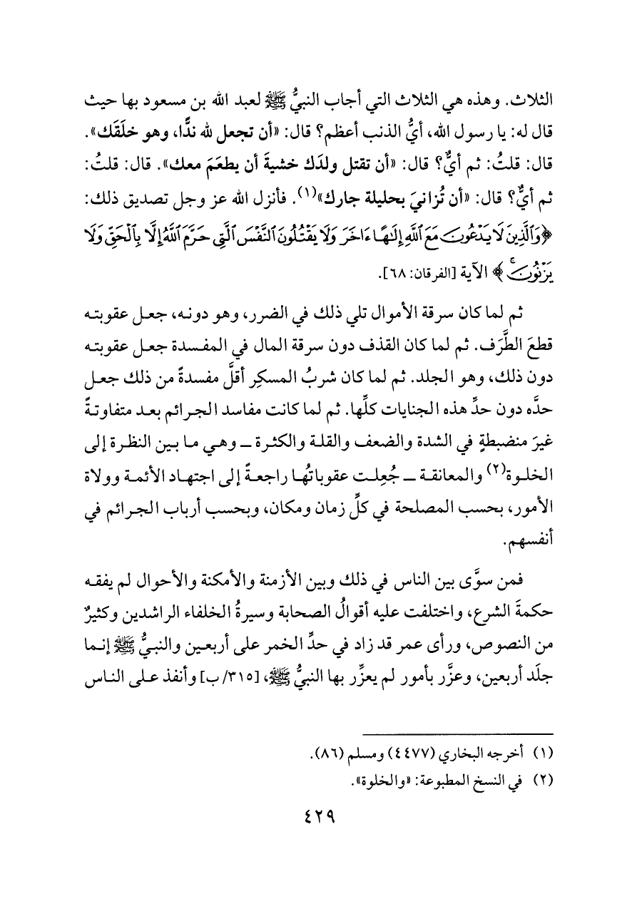 ثم لما كان سرقة الأموال تلي ذلك في الضرر، وهو دونه، جعل عقوبته قطعَ الطَّرَف. ثم لما كان القذف دون سرقة المال في المفسدة جعل عقوبته دون ذلك، وهو الجلد. ثم لما كان شربُ المسكِر أقلَّ مفسدةً من ذلك جعل حدَّه دون حدِّ هذه الجنايات كلِّها. ثم لما كانت مفاسد الجرائم بعد متفاوتةً غيرَ منضبطةٍ في الشدة والضعف والقلة والكثرة ــ وهي ما بين النظرة إلى الخلوة (¬٢) والمعانقة ــ جُعِلت عقوباتُها راجعةً إلى اجتهاد الأئمة وولاة الأمور، بحسب المصلحة في كلِّ زمان ومكان، وبحسب أرباب الجرائم في أنفسهم.