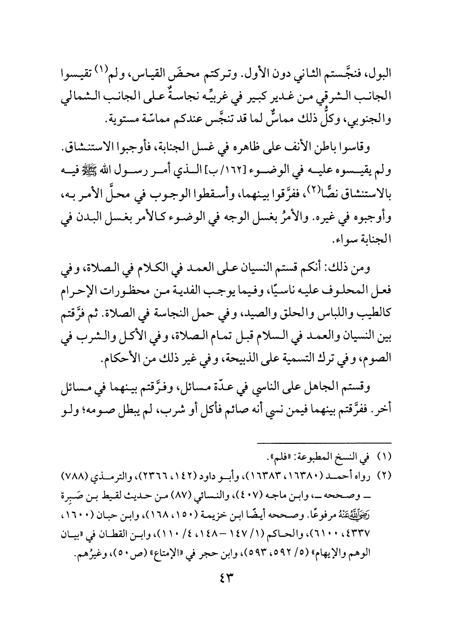 ومن ذلك: أنكم قستم النسيان على العمد في الكلام في الصلاة، وفي فعل المحلوف عليه ناسيًا، وفيما يوجب الفدية من محظورات الإحرام كالطيب واللباس والحلق والصيد، وفي حمل النجاسة في الصلاة. ثم فرَّقتم بين النسيان والعمد في السلام قبل تمام الصلاة، وفي الأكل والشرب في الصوم، وفي ترك التسمية على الذبيحة، وفي غير ذلك من الأحكام.