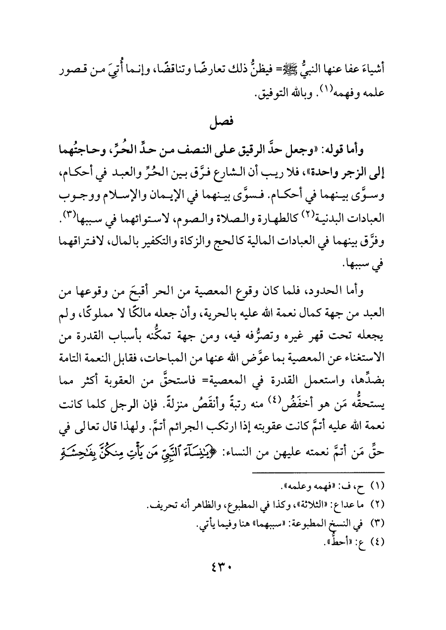 وأما قوله: «وجعل حدَّ الرقيق على النصف من حدِّ الحُرِّ، وحاجتُهما إلى الزجر واحدة»، فلا ريب أن الشارع فرَّق بين الحُرِّ والعبد في أحكام، وسوَّى بينهما في أحكام. فسوَّى بينهما في الإيمان والإسلام ووجوب العبادات البدنية (¬٢) كالطهارة والصلاة والصوم، لاستوائهما في سببها (¬٣). وفرَّق بينهما في العبادات المالية كالحج والزكاة والتكفير بالمال، لافتراقهما في سببها.
