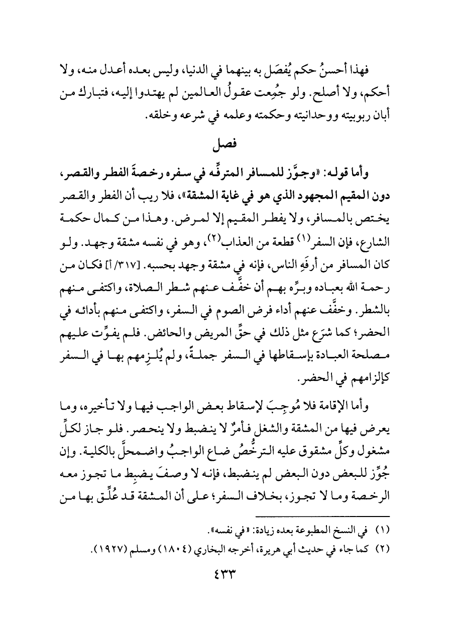وأما قوله: «وجوَّز للمسافر المترفِّه في سفره رخصةَ الفطر والقصر، دون المقيم المجهود الذي هو في غاية المشقة»، فلا ريب أن الفطر والقصر يختص بالمسافر، ولا يفطر المقيم إلا لمرض. وهذا من كمال حكمة الشارع، فإن السفر (¬١) قطعة من العذاب (¬٢)، وهو في نفسه مشقة وجهد. ولو كان المسافر من أرفَهِ الناس، فإنه في مشقة وجهد بحسبه. [٣١٧/أ] فكان من رحمة الله بعباده وبرِّه بهم أن خفَّف عنهم شطر الصلاة، واكتفى منهم بالشطر. وخفَّف عنهم أداء فرض الصوم في السفر، واكتفى منهم بأدائه في الحضر؛ كما شرَع مثل ذلك في حقِّ المريض والحائض. فلم يفوِّت عليهم مصلحة العبادة بإسقاطها في السفر جملةً، ولم يُلزِمهم بها في السفر كإلزامهم في الحضر.