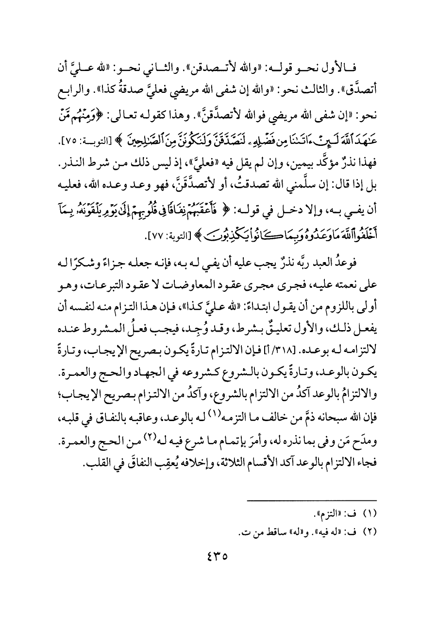 فالأول نحو قوله: «والله لأتصدقن». والثاني نحو: «لله عليَّ أن أتصدَّق». والثالث نحو: «والله إن شفى الله مريضي فعليَّ صدقةُ كذا». والرابع نحو: «إن شفى الله مريضي فوالله لأتصدَّقنَّ». وهذا كقوله تعالى: {وَمِنْهُمْ مَنْ عَاهَدَ اللَّهَ لَئِنْ آتَانَا مِنْ فَضْلِهِ لَنَصَّدَّقَنَّ وَلَنَكُونَنَّ مِنَ الصَّالِحِينَ} [التوبة: ٧٥]. فهذا نذرٌ مؤكَّد بيمين، وإن لم يقل فيه «فعليَّ»، إذ ليس ذلك من شرط النذر. بل إذا قال: إن سلَّمني الله تصدقتُ، أو لأتصدَّقَنَّ، فهو وعد وعده الله، فعليه أن يفي به، وإلا دخل في قوله: {فَأَعْقَبَهُمْ نِفَاقًا فِي قُلُوبِهِمْ إِلَى يَوْمِ يَلْقَوْنَهُ بِمَا أَخْلَفُوا اللَّهَ مَا وَعَدُوهُ وَبِمَا كَانُوا يَكْذِبُونَ} [التوبة: ٧٧].