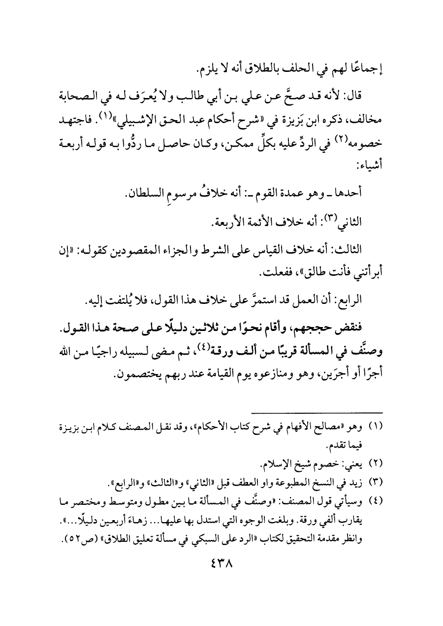 قال: لأنه قد صحَّ عن علي بن أبي طالب ولا يُعرَف له في الصحابة مخالف، ذكره ابن بَزيزة في «شرح أحكام عبد الحق الإشبيلي» (¬١). فاجتهد خصومه (¬٢) في الردِّ عليه بكلِّ ممكن، وكان حاصل ما ردُّوا به قوله أربعة أشياء: