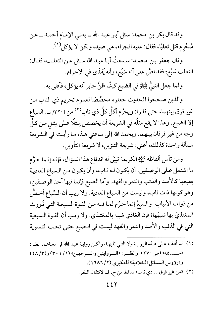 وقال جعفر بن محمد: سمعتُ أبا عبد الله سئل عن الثعلب، فقال: الثعلب سَبُع؛ فقد نصَّ على أنه سَبُع، وأنه يُفدَى في الإحرام.