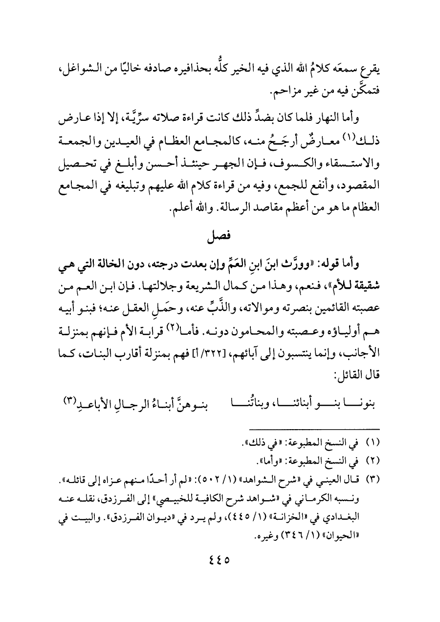 وأما قوله: «وورَّث ابنَ ابنِ العَمِّ وإن بعدت درجته، دون الخالة التي هي شقيقة للأم»، فنعم، وهذا من كمال الشريعة وجلالتها. فإن ابن العم من عصبته القائمين بنصرته وموالاته، والذَّبِّ عنه، وحَملِ العقل عنه؛ فبنو أبيه هم أولياؤه وعصبته والمحامون دونه. فأما (¬٢) قرابة الأم فإنهم بمنزلة الأجانب، وإنما ينتسبون إلى آبائهم، [٣٢٢/أ] فهم بمنزلة أقارب البنات، كما قال القائل: