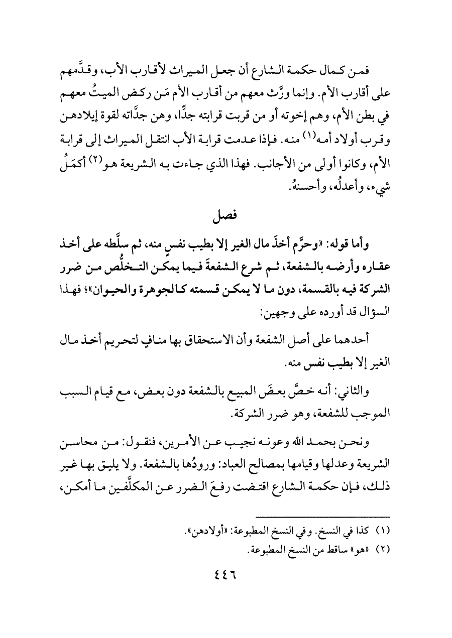 ونحن بحمد الله وعونه نجيب عن الأمرين، فنقول: من محاسن الشريعة وعدلها وقيامها بمصالح العباد: ورودُها بالشفعة. ولا يليق بها غير ذلك، فإن حكمة الشارع اقتضت رفعَ الضرر عن المكلَّفين ما أمكن،