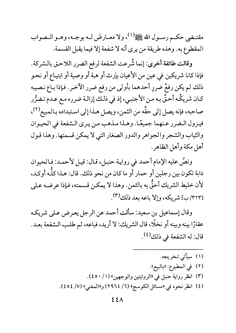 وقالت طائفة أخرى: إنما شُرعت الشفعة لرفع الضرر اللاحق بالشركة. فإذا كانا شريكين في عين من الأعيان بإرث أو هبة أو وصية أو ابتياع أو نحو ذلك لم يكن رفعُ ضررِ أحدهما بأولى من رفع ضرر الآخر. فإذا باع نصيبه كان شريكُه أحقَّ به من الأجنبي، إذ في ذلك إزالة ضرره مع عدم تضرُّر صاحبه، فإنه يصل إلى حقِّه من الثمن، ويصل هذا إلى استبداده بالمبيع (¬٢)، فيزول الضرر عنهما جميعًا. وهذا مذهب من يرى الشفعة في الحيوان والثياب والشجر والجواهر والدور الصغار التي لا يمكن قسمتها. وهذا قول أهل مكة وأهل الظاهر.