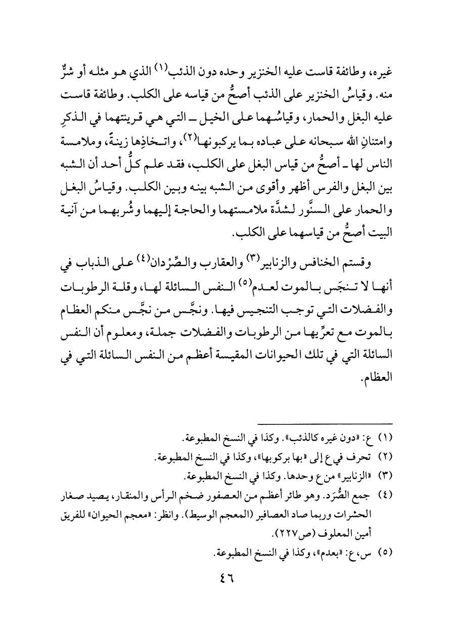 وقستم الخنافس والزنابير (¬٣) والعقارب والصِّرْدان (¬٤) على الذباب في أنها لا تنجَس بالموت لعدم (¬٥) النفس السائلة لها، وقلة الرطوبات والفضلات التي توجب التنجيس فيها. ونجَّس من نجَّس منكم العظام بالموت مع تعرِّيها من الرطوبات والفضلات جملة، ومعلوم أن النفس السائلة التي في تلك الحيوانات المقيسة أعظم من النفس السائلة التي في العظام.