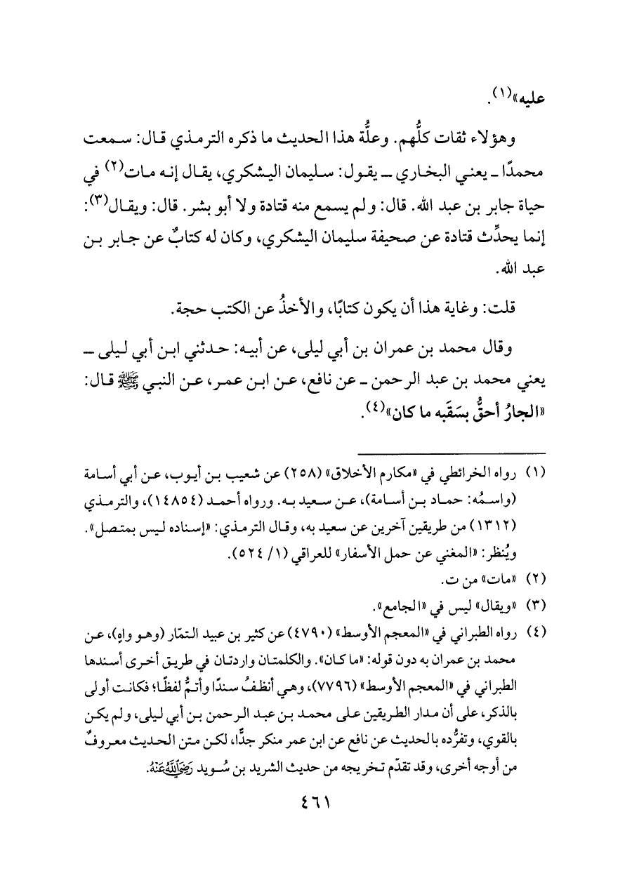 وهؤلاء ثقات كلُّهم. وعلُّة هذا الحديث ما ذكره الترمذي قال: سمعت محمدًا ــ يعني البخاري ــ يقول: سليمان اليشكري، يقال إنه مات (¬٢) في حياة جابر بن عبد الله. قال: ولم يسمع منه قتادة ولا أبو بشر. قال: ويقال (¬٣): إنما يحدِّث قتادة عن صحيفة سليمان اليشكري، وكان له كتابٌ عن جابر بن عبد الله.