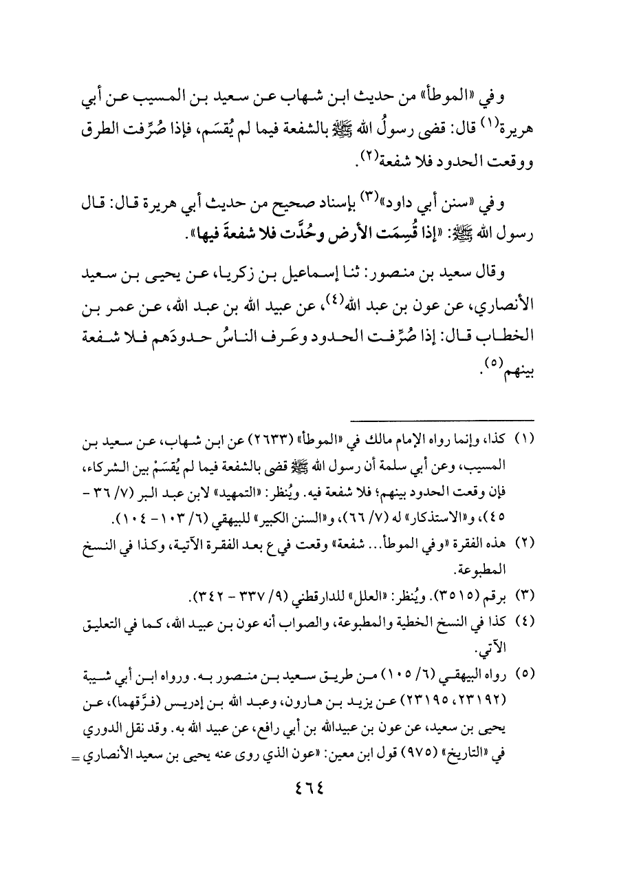 (¬١) كذا، وإنما رواه الإمام مالك في «الموطأ» (٢٦٣٣) عن ابن شهاب، عن سعيد بن المسيب، وعن أبي سلمة أن رسول الله - صلى الله عليه وسلم - قضى بالشفعة فيما لم يُقسَمْ بين الشركاء، فإن وقعت الحدود بينهم؛ فلا شفعة فيه. ويُنظر: «التمهيد» لابن عبد البر (٧/ ٣٦ - ٤٥)، و «الاستذكار» له (٧/ ٦٦)، و «السنن الكبير» للبيهقي (٦/ ١٠٣ - ١٠٤).