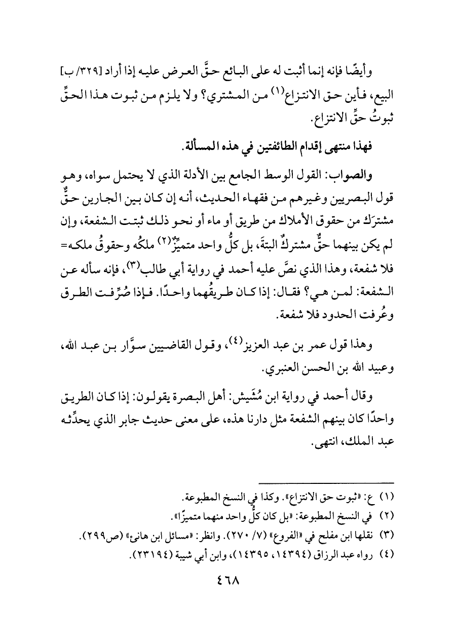 والصواب: القول الوسط الجامع بين الأدلة الذي لا يحتمل سواه، وهو قول البصريين وغيرهم من فقهاء الحديث، أنه إن كان بين الجارين حقٌّ مشترَك من حقوق الأملاك من طريق أو ماء أو نحو ذلك ثبتت الشفعة، وإن لم يكن بينهما حقٌّ مشتركٌ البتةَ، بل كلُّ واحد متميِّزٌ (¬٢) ملكُه وحقوقُ ملكه= فلا شفعة، وهذا الذي نصَّ عليه أحمد في رواية أبي طالب (¬٣)، فإنه سأله عن الشفعة: لمن هي؟ فقال: إذا كان طريقُهما واحدًا. فإذا صُرِّفت الطرق وعُرفت الحدود فلا شفعة.