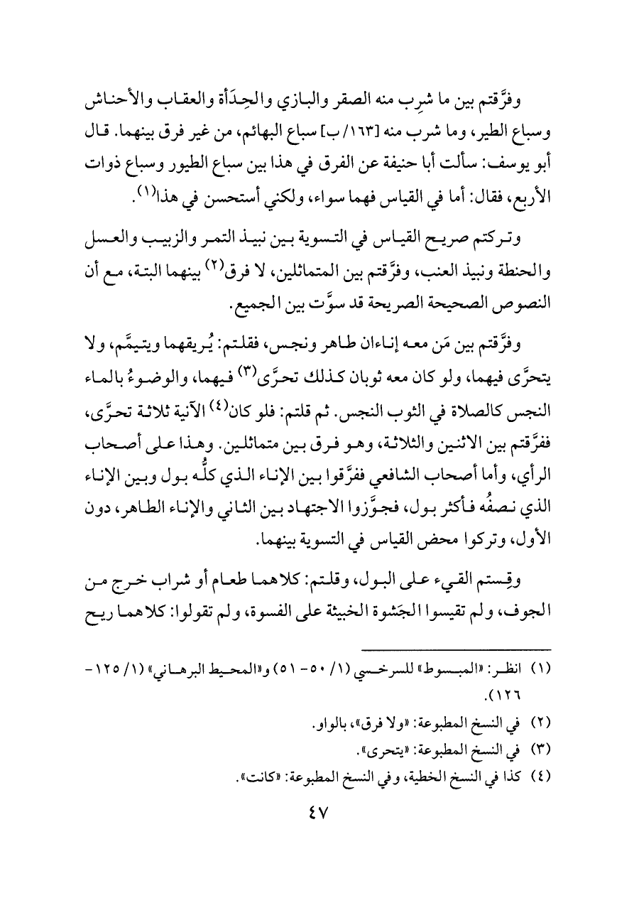 وفرَّقتم بين ما شرِب منه الصقر والبازي والحِدَأة والعقاب والأحناش وسباع الطير، وما شرب منه [١٦٣/ب] سباع البهائم، من غير فرق بينهما. قال أبو يوسف: سألت أبا حنيفة عن الفرق في هذا بين سباع الطيور وسباع ذوات الأربع، فقال: أما في القياس فهما سواء، ولكني أستحسن في هذا (¬١).