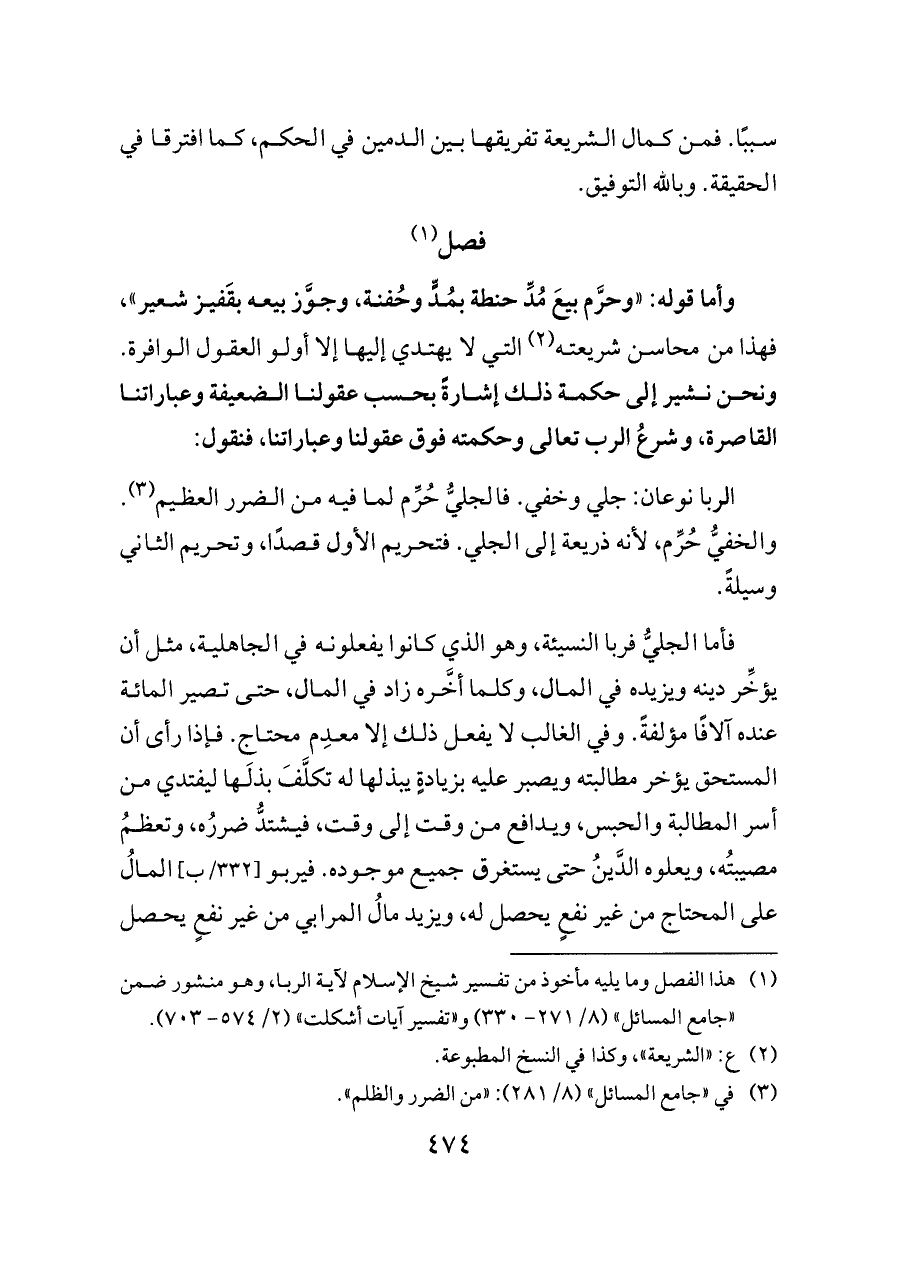 (¬١) هذا الفصل وما يليه مأخوذ من تفسير شيخ الإسلام لآية الربا، وهو منشور ضمن «جامع المسائل» (٨/ ٢٧١ - ٣٣٠) و «تفسير آيات أشكلت» (٢/ ٥٧٤ - ٧٠٣).